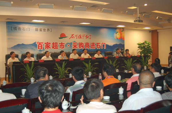 为搞好今年的柑橘销售,帮助橘农增产增收,石门县委、县政府提前谋划柑橘销售大计。自9月初起,县委、县政府不惜重金在中央电视台、湖南卫视等国内主流媒体上打造“石门柑橘”品牌形象。9月10日和12日,在长春、西安连续举办的两场“石门柑橘”产销对接会上,东北、西北两地的购销签约量达到23万吨。为了让石门柑橘在今年国庆前后走进全国大中城市的高端市场,在中国果品流通协会的大力支持下,国庆前夕,石门县人民政府又邀请了全国各地的数百家超市老总前来石门。9月26日,包括北京新合作连锁集团、沃尔玛驻湖南采购部、步步高商业连锁股份有限公司、深圳百果园实业发展有限公司在内的129家超市和果品采购商实地考察了石门秀坪、龙凤等园艺场和金湘源果蔬加工基地,随即与石门的30家园艺场、柑橘专业合作社和柑橘加工企业对接洽谈,现场采购石门早熟蜜橘。据石门县农产品流通办公室统计,当日签订农超对接商务合同书129份,柑橘购销总量达6万吨。首批20000吨石门柑橘将在国庆前夕陆续进入全国各大中城市超市,供应国庆市场。