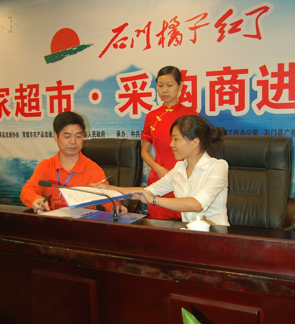 石门橘农之友柑橘合作社副理事长陈凌娇与北京新合作连锁集团副经理陈祖新当场签订了10000吨的柑橘购销合同