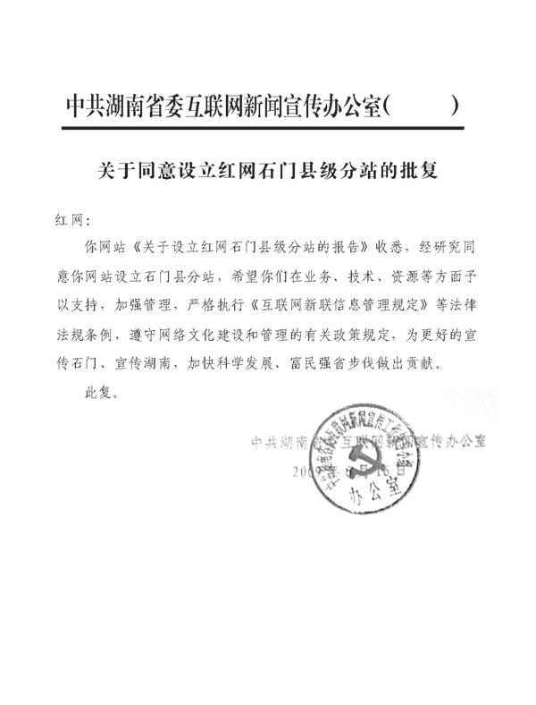 湖南省委互联网宣传办公室关于同意设立红网石门分站的批复