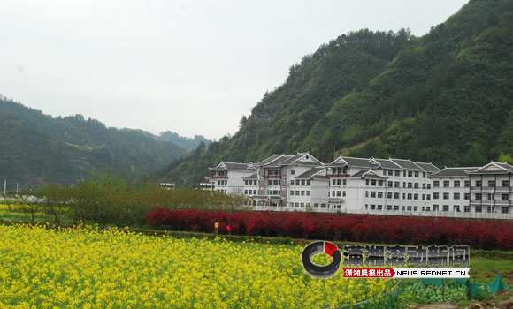4月3日下午,潇湘晨报滚动新闻记者来到了武陵源二中新校舍的所在地——张家界市武陵源区中湖乡,地处天子山和杨家界两大著名景区中间,校舍建筑小青瓦、斜坡面、外挑檐、转角楼、浅灰墙,颇具土家吊脚楼风格,加上背靠青山,还有小河从学校旁边走过,可谓依山傍水,还有对面农田盛开的油菜花等,构成了一幅田园美景。