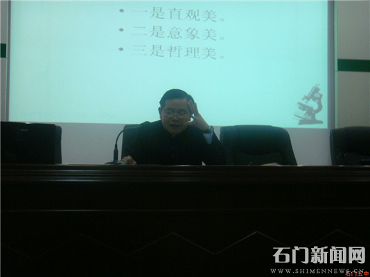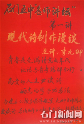 10月18日晚,石门五中语文高级教师、诗歌爱好者李九卿在学校阶梯教室做了一场题为《现代诗创作漫谈》的精彩讲座,标志着该校“名师讲坛”系列活动暨学校选修课程正式拉开了帷幕。全校有近400学生聆听了李九卿的讲座。