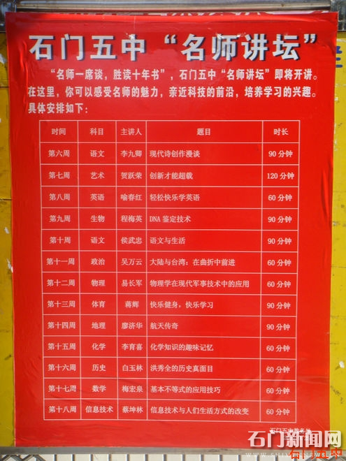 “名师讲坛”活动是该校教研和校本课程开发方面的一个新的举措,旨在通过这个活动的开展来培养学生的学习兴趣、促进教研。本学期共安排12个科目的13位名师讲课。