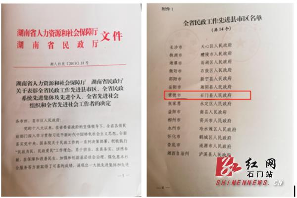 6月12日,在湖南省第十八次民政会议“全省民政工作先进县市区”荣誉称号的名单中,石门县榜上有名。这是石门民政继2006年荣获“全省民政工作先进县”、2012年评为全国民政系统先进集体以来获得的又一项沉甸甸的荣誉。